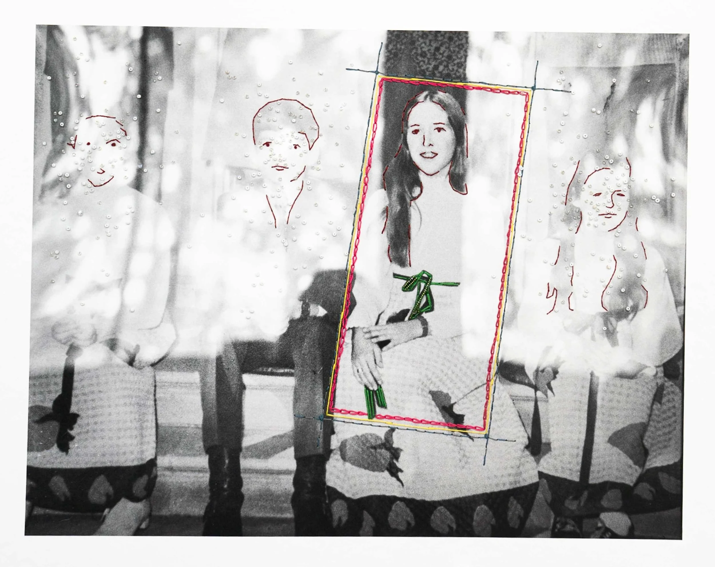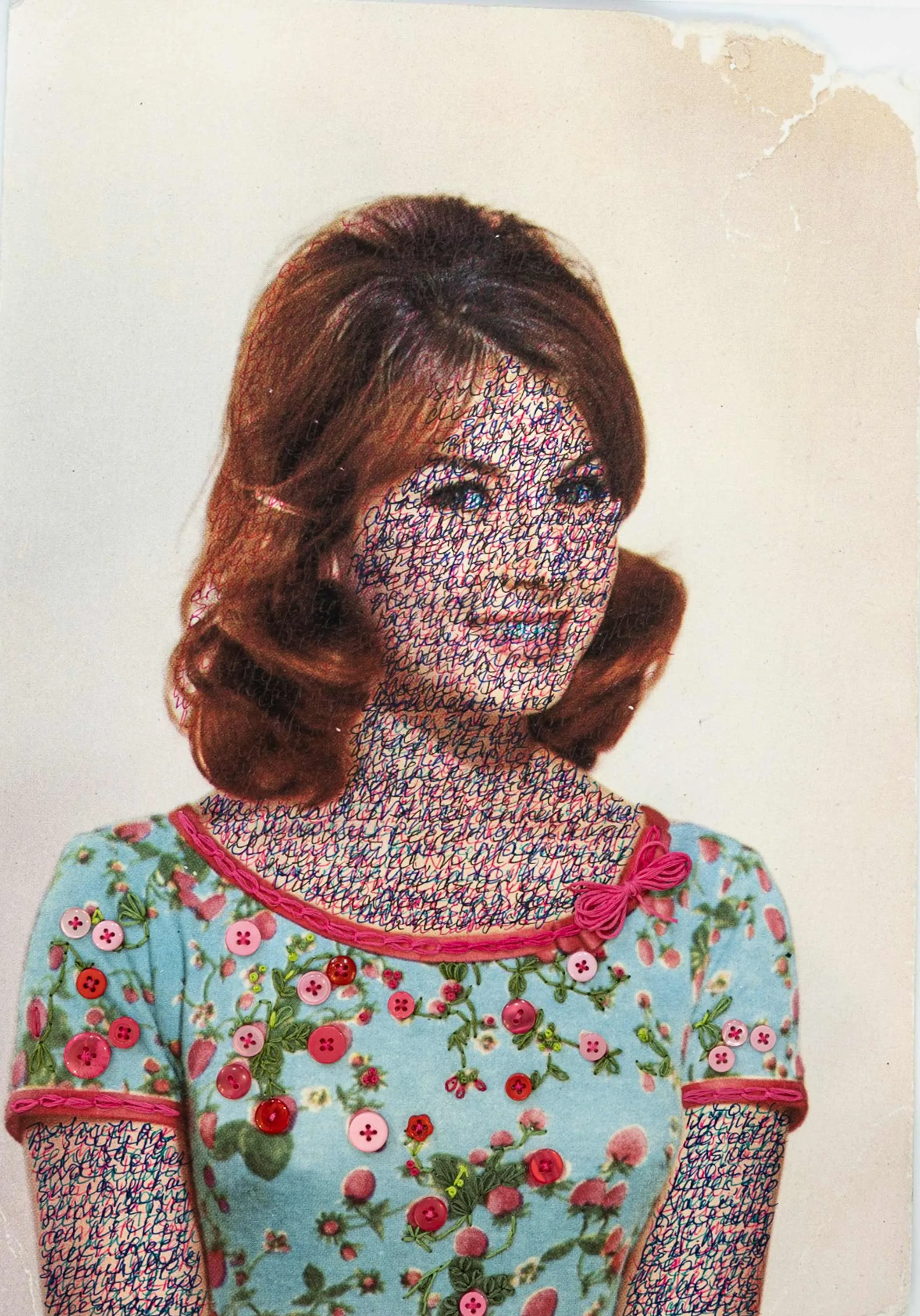 These multimedia pieces combine photography with thread, fabric, beads, and buttons to complicate notions of static or singular identity. Sewing allows me to layer and challenge the image, to explore how memory can be fictionalized, photographic, and emotional. The work is intentionally tactile, handmade, to push back against the ephemeral nature of digital and AI generated imagery. These pieces are one of a kind; these pieces are defiantly human. By paying homage to traditional women’s crafts, ones I learned myself as a girl, this project bittersweetly anticipates a future where we may have little tangible evidence of our domestic lives.