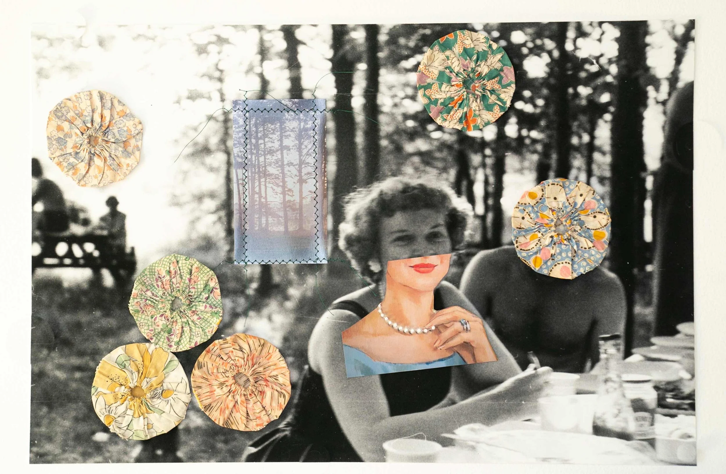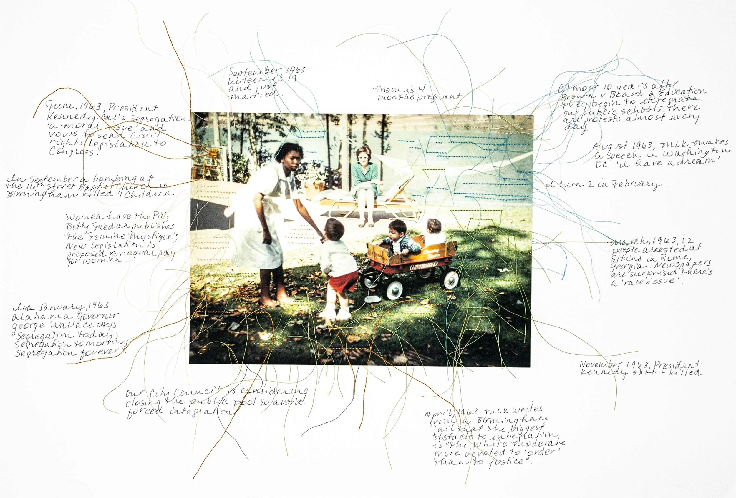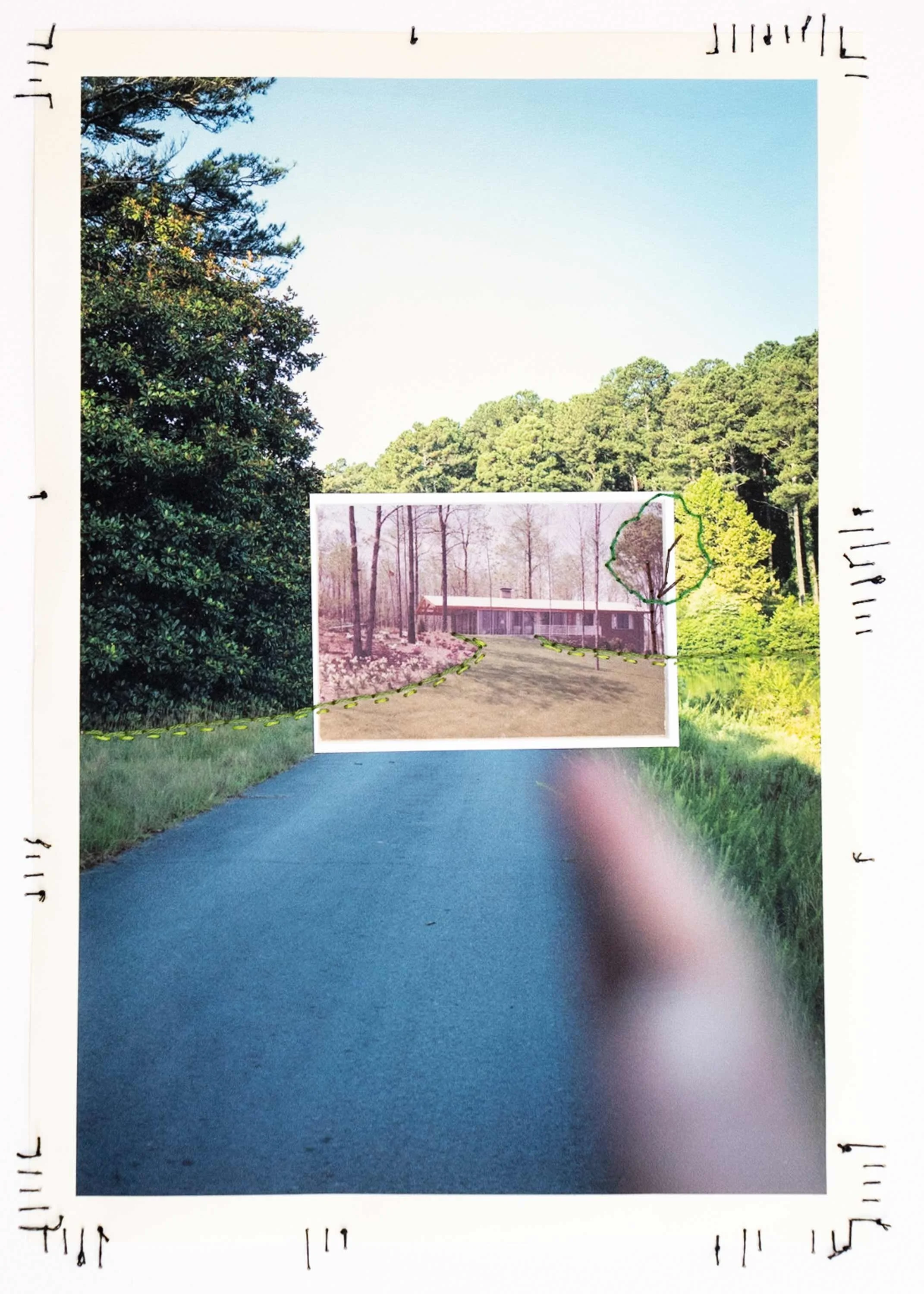 With these collages, I am reexamining my childhood in the South in the 60s to investigate the influences of embedded segregation, a specific model of womanhood, and a deep and fraught tie to home and place shared by many folks from the South. ADD|MIX|FOLD functions as a visual memoir, wherein I’ve sewn and cut into my photographs to create objects that reference the influence the past holds on our lives in the present. The title comes from a family pound cake recipe, and serves as a metaphor for how we blend and slice up stories and memories to make sense of ourselves during these extraordinary, frenetic, ephemeral times.