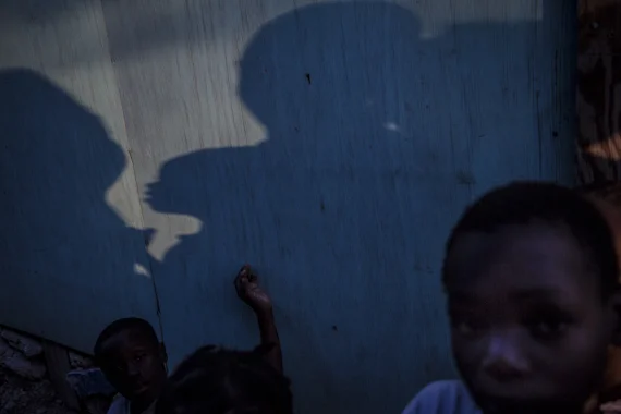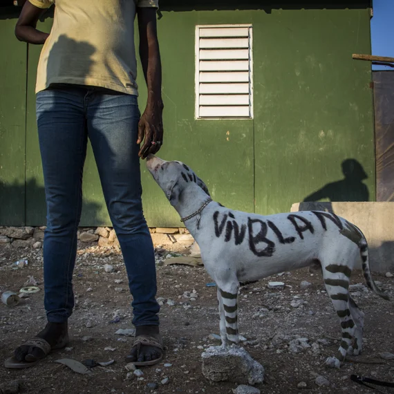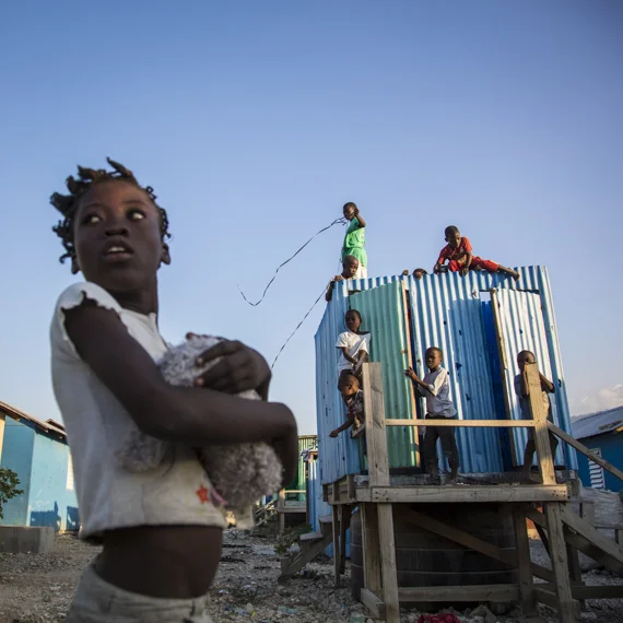 In 2014 I am still photographing play, and joy, and resilience, which has brought me back to Haiti. I take it as a sign of progress and healing that Surpiste was closed in 2012. It’s sister “temporary” camp across the road, La Piste, is still active however, and as we approach it confusingly appears bright and orderly, with an unusual rainbow palette of carefully placed houses. Strangely I notice a kid pushing an extra-wide wheel chair such as we use for obese Americans, which seems a particular irony here in the slums. Then there are lots of wheelchairs, and they are being used to cart both people and cans, in search, I realize, of water. There is a woman missing a leg; a group of men engaged in the chaotic language of the deaf, and I finally appreciate that this is a camp for the handicapped. It was established by an NGO as a safe and supportive temporary camp to protect the most vulnerable from the chaos of the larger displacement camps. The La Piste I’m visiting now is still home to 400 families.
