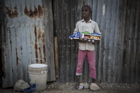 Suddenly I am alive, and I am in Haiti. I am on a search for toys, because toys are linked to play, and play is linked to being human, or so I think, so I’m taking my camera to Haiti to explore this idea. I find myself in the evening light at La Piste, an old airfield, very near Surpiste, “the runway”, which I had known from the 2010 post-earthquake days as the site of one of the largest displacement camps. I have a photo of a boy from that time scurrying off with prized slabs of concrete on his head. I photographed banks of cell phones, as orderly as fish at the market, drinking precious electricity and lining the pocket of someone very clever. In this instant, tragic community, barbershops and food stores had opened within hours, and the arrival of NGOs to fill the giant bladders of fresh water was avidly monitored. What I remember most is poverty, extreme poverty, and a quiet mist of fear that subsumed all of us in Haiti in early 2010; fear that random powers — disease, violence, geology, politics — could reach out again, anytime. Even now the damp pervasiveness of that fear is tangible to me as I look at those photos.